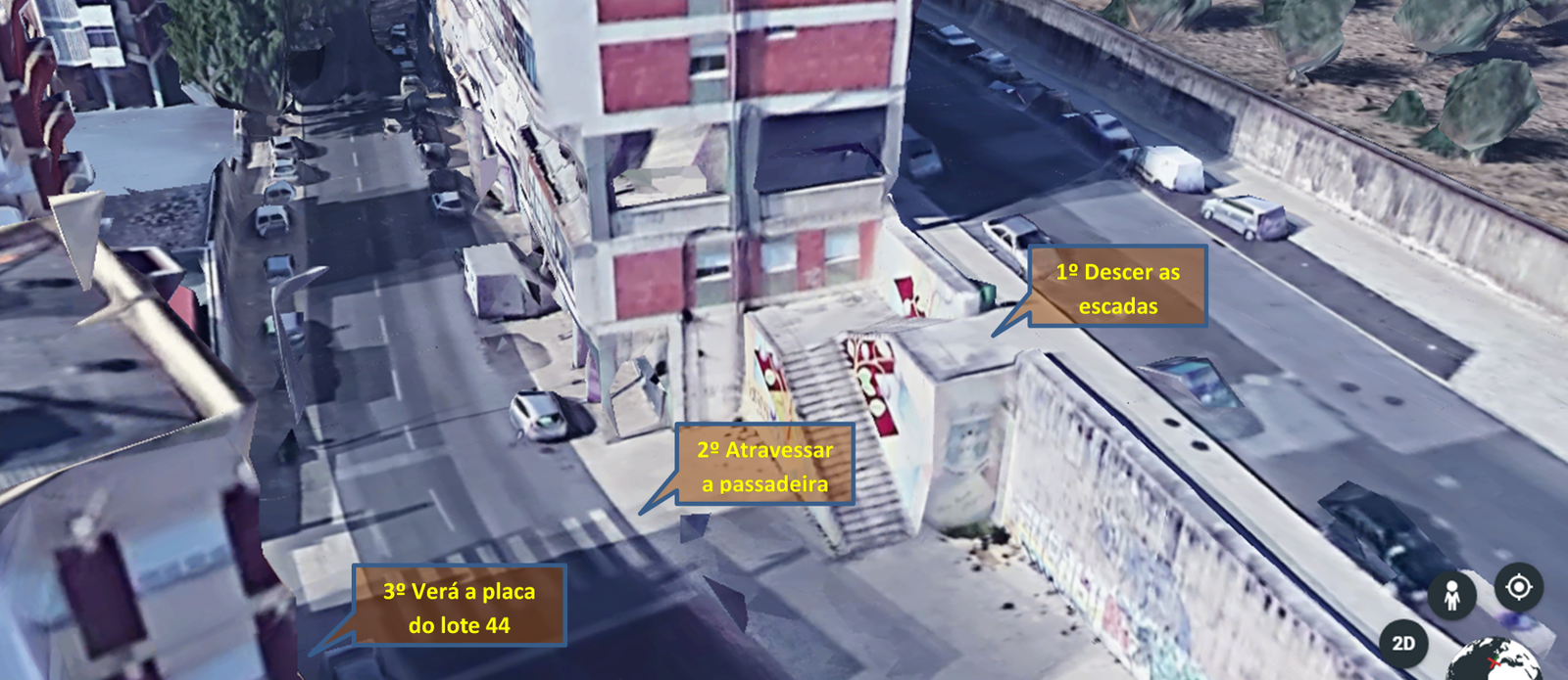 Passados 300 mts, verá umas escadas para descer. Descer as escadas (verá a placa do lote 44 à frente). Em frente às escadas, atravessar a passadeira para o outro lado. Caminhar 20 mts para a esquerda. Verá umas escadas à direita. Descer essas escadas até ao fim.