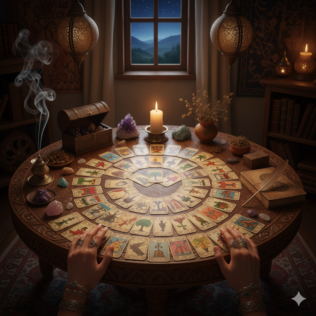 A Mesa Real é o “Everest” do Baralho Cigano. É o método mais completo, usando todas as 36 cartas de uma só vez para oferecer um panorama total da vida do consulente. Diferentemente de tiragens pequenas que respondem a perguntas isoladas (“Vou conseguir o emprego?”), a Mesa Real conta uma história completa: passado, presente, futuro, pensamentos ocultos, influências externas e o destino final.